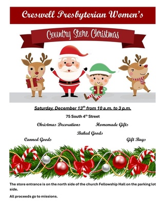 The Creswell Chamber of Commerce Board is excited to host the annual Creswell Winter Lights event on Saturday, December 13th. Santa will be here and there will be music in the street, a light parade, a vendor market, and hot cocoa and cider in various locations downtown. A Holiday Vendor Market with both handmade goods and direct sales businesses with a visit from Santa. Bring your family down for a special picture with Santa from 11am-3pm. Vendors - Gifts, Food, Crafts Where: Community Center | 99 S. 1st St. Where: 1st Street & Oregon Ave. Creswell Grange Vintage, Craft & Bake Sale Where: Creswell Grange | 298 W Oregon Ave. Creswell Presbyterian Women's Country Store Christmas Where: Inside the Fellowship Hall of Presbyterian Church, 75 South 4th Street